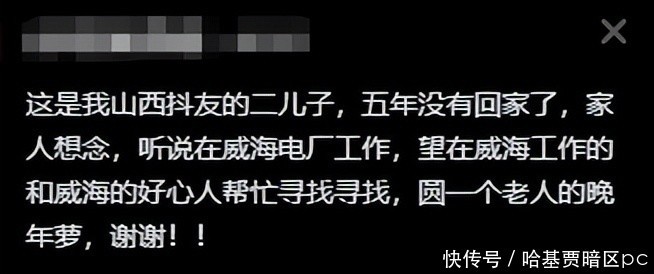 这名博主表示,照片上的人是朋友的孩子,已经有五年时间没有回家了,听说是在威海工作,希望威海的好心人能够帮忙寻找一下,圆一个老年的晚年梦。
